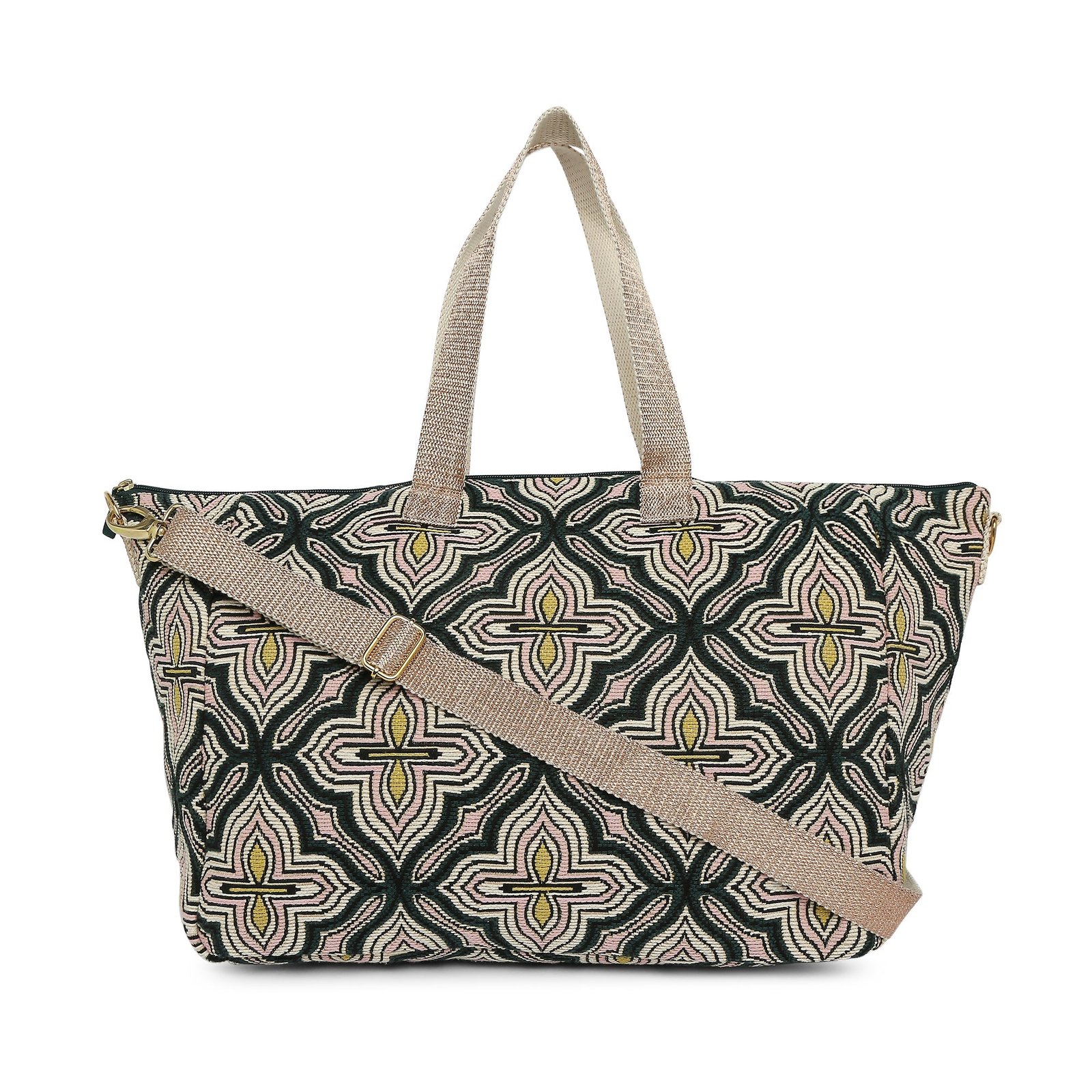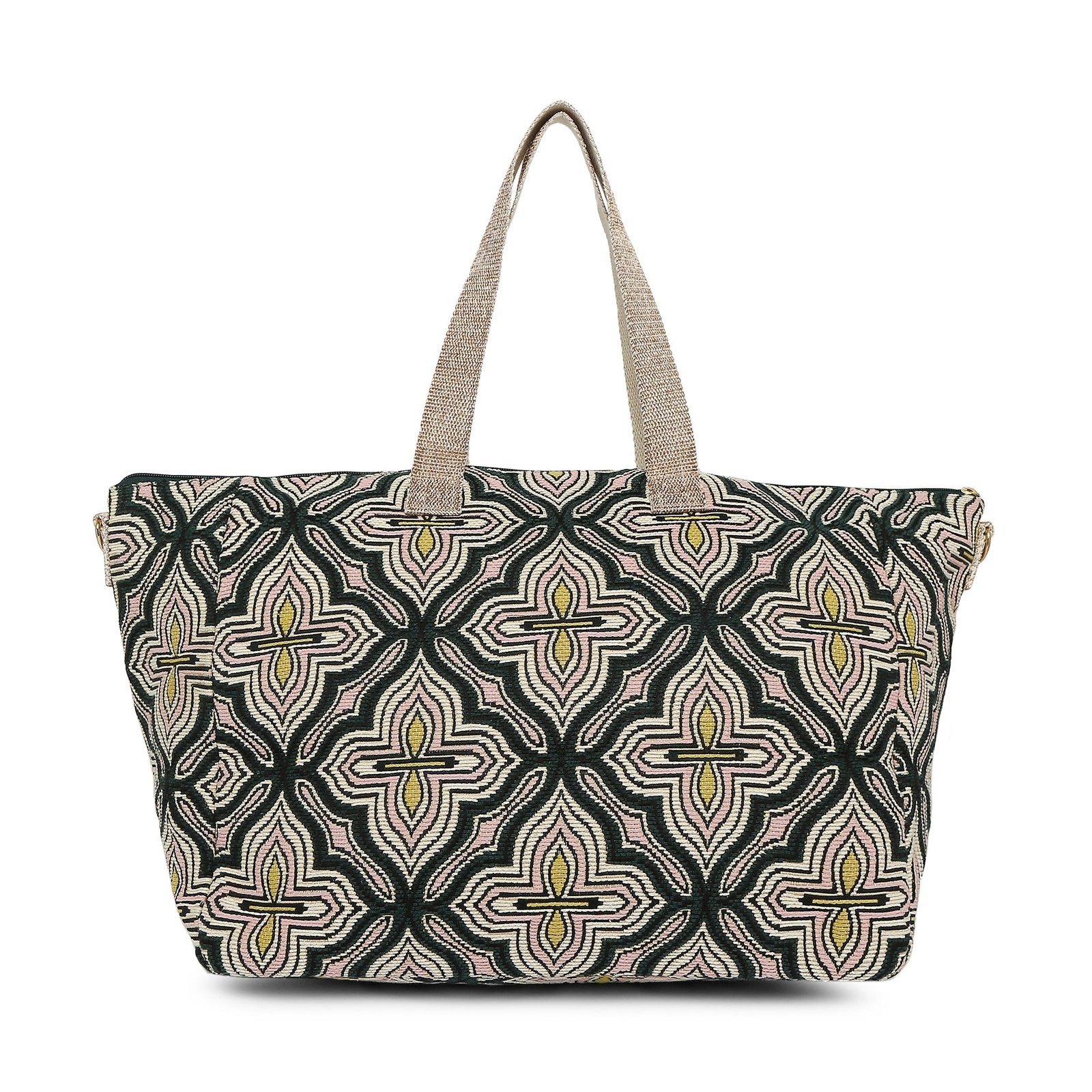 The spacious interior easily holds your clothing, toiletries, and essentials, while multiple pockets keep your belongings organized. Crafted with durable fabric and sturdy handles, this bag is lightweight yet strong enough for daily travel. Stylish, practical, and versatile, this green tile print weekender bag is the perfect accessory for modern women on the go.